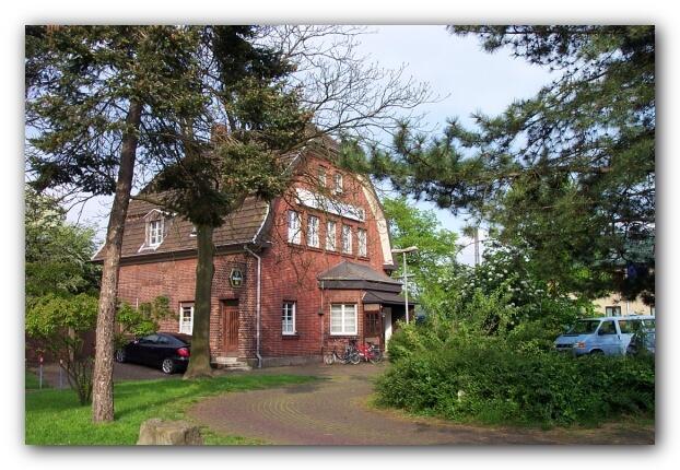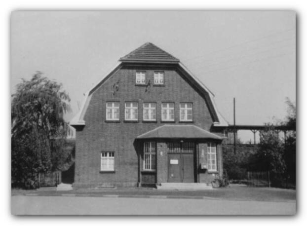 Die Staatsbahnlinie Moers - Kleve wurde am 15. August 1904 eröffnet. Der erste Bahnhof Rumeln war eine Holzbaracke. Als nach dem Weltkrieg 1914 / 18 trotz des wirtschaftlichen Niedergangs wieder größere Ansprüche an die Sicherheit des Verkehr gestellt wurden , erwies es sich als notwendig , die Strecke von Friemersheim bis Trompet hoch zu legen. 1919/20 , 21 entstand der Damm. Der alte Bahnhof verschwand und dient heute als Wohnhaus. Am 18.10.1921 wurde ein neues Bahnhofsgebäude an anderer Stelle errichtet , das in seinen inneren Einrichtungen den Erfordernissen der neuen Zeit und des immer anwachsenden Verkehrs genügte.